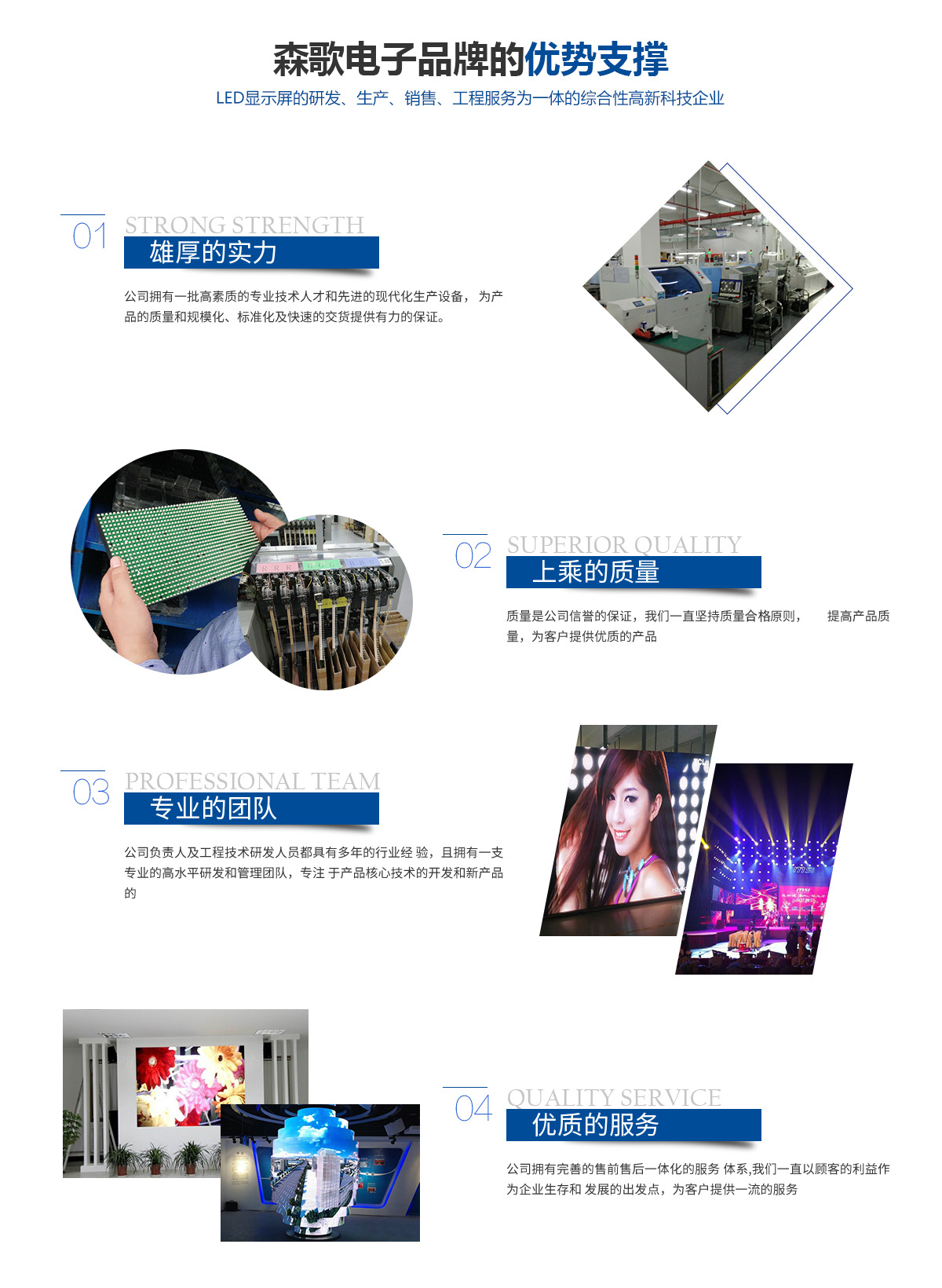 鄭州森歌電子科技有限公司是一家專業從事LED顯示屏的生產、銷售、工程服務為一體的高新科技企業。公司擁有一批高素質的專業技術人才和先進的現代化生產設備,公司的主要負責人及工程技術研發人員都具有15年以上的LED行業經驗,擁有一支專業的高水平研發和管理團隊,專注于LED核心技術的開發和LED新產品的自主創新,為產品的質量和規模化、標準化及快速的交貨提供有力的保證。公司在福建、深圳建立了生產基地。 鄭州森歌電子科技堅持以方案完善,質量過硬,服務及時為口號,堅持走高品質路線?,F我公司工程業績已遍布省內外,并且在政府機構、軍事指揮、銀行系統、醫療教育、室內外廣告、酒店會所、公安指揮調度、水利工程、視頻會議等多個行業領域得到廣泛應用并獲得客戶的一致好評和普遍認可,是客戶值得信賴的長期戰略合作伙伴。